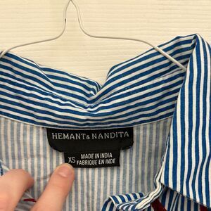 Hemant & Nandita Marne Striped Shirt Size XS Velvet Detail Blouse Striped Collar