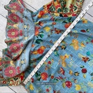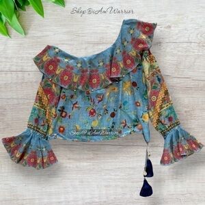 Stunning Revolve Hemant & Nandita silk blue floral cropped top with sexy draped ruffle neckline and sleeves. Has beaded accents & adjustable tassel drawstring waist thatโs perfect for pairing with high waisted denim or shorts. Retailed at $260 & sold out! Listed at retail due to NWT condition, value & rarity! Size small, see photos for measurements.