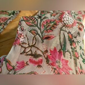 Size XS new with tags romper from Hemant & Nandita. Nora style, perfect condition, the only flaw is that it is missing the waist tie, but honestly looks better without IMO. Perfect for summer. Pink and green floral print, ethereal cottagecore vibes, sheer sleeves and string tassels. Check out the pictures for measurements!