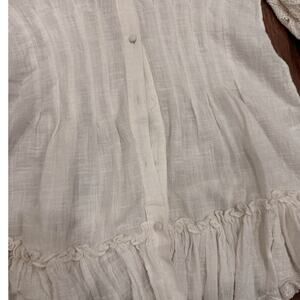Romantic and ethereal short dress from Hemant & Nandita. Crafted in a breezy cambric cotton gauze with gorgeous embroidered lace details, balloon sleeves, and a soft ruffled hem. Features a cinched waist with optional tie belt and a flattering scoop back. The perfect effortless summer statement piece — wear for brunch, beach dinners, or vacation styling.