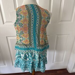 The Hemant Nandita Women's 100% Silk Top in XSP Petite is a stylish and versatile piece perfect for various occasions such as travel, weddings, parties, or casual wear. This boho hippie festival-inspired top in blue features a floral pattern, sleeveless design, round neckline, and tie keyhole closure. Made from luxurious silk material, it also includes tiered ruffles and sequin accents, adding a touch of whimsy to the tunic-style blouse.