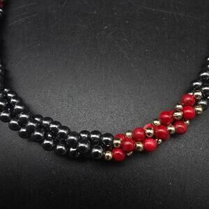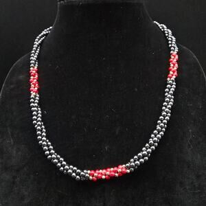 This necklace features twisted strands of hematite beads with red accent beads and measures 22" L