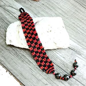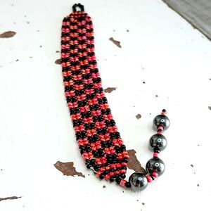 Glass seed beads in shades of iridescent red & black with round hematite accents