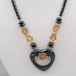 Hematite Open Heart Pendant Statement Necklace Orange Bead Accents 16"