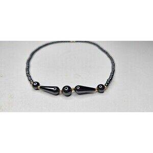 Beautiful hematite and gold tone beaded necklace. Features round and tear drop shaped hematite beads and small round gold tole spacer beads. Gold Tone barrel clasp closure.
