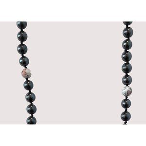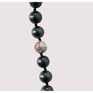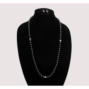 Elegant hematite jewelry set featuring a pair of pierced drop earrings and a 30" necklace. Black beads with three decorative white floral beads are strung in a single unending strand. Perfect for adding a touch of elegance to any outfit.