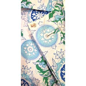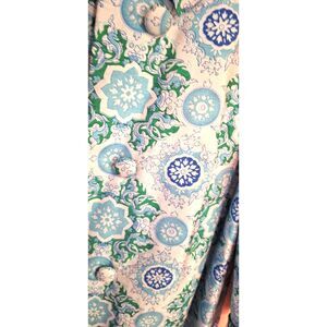 The outside is a light blue with a darker blue and green print, this jacket has 3/4 length sleeves with a cuff at the end, it has 4 covered buttons that are hidden when they are buttoned up. 2 pockets are on the sides.