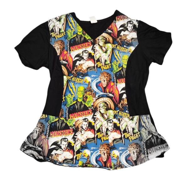 Hemet Medical Scrub Top Woman Size Medium Classic Monsters Halloween