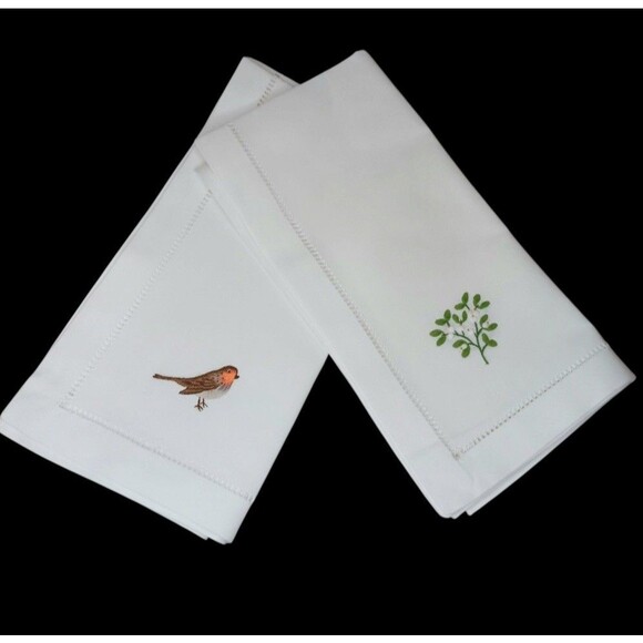 Hemstitch White Cotton Napkins With Bird And Flower Embroidered Set Of Two 19.5"
