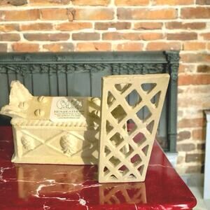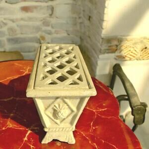 Hen Feathers small metal flower brick beige in color with pineapples embossed on the sides with a rack on top for the flowers this metal flower frog planter is super heavy and super sturdy yes it is (used) but you could never tell by it's condition