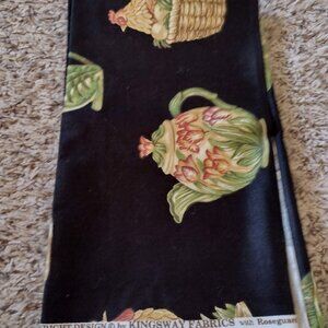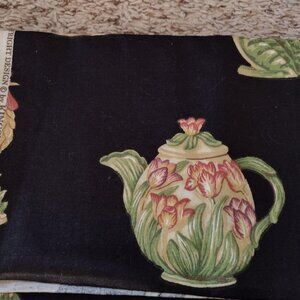 Gorgeous country hen and floral teapot motif cotton fabric, 56 x 28. "Majolica" theme, by Kingsway Fabrics. Colors are black, cream, green, and pink. Smoke-free and pet-free home.