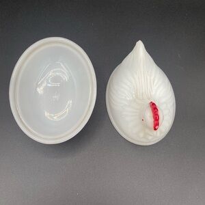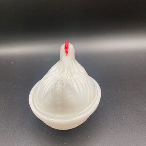 Charming hen on a nest- mini. White body with red accents. Perfect for decor or storage.