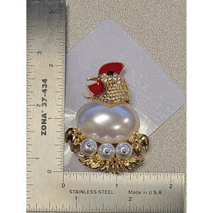 This charming brooch features a hen with soon-to-be baby chicks, beautifully enameled and adorned with sparkling rhinestones. It's a delightful accessory to celebrate new beginnings and add a touch of whimsy to any outfit.