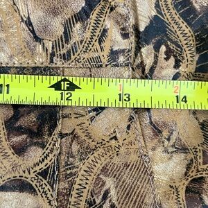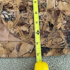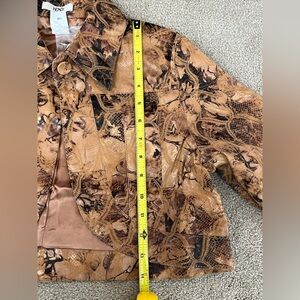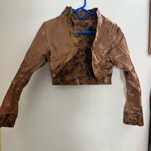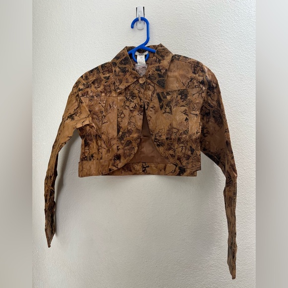 Stylish brown cropped jacket with a unique pattern. Perfect for adding a touch of elegance to any outfit. The material is light and feels like paper. It is also lined.