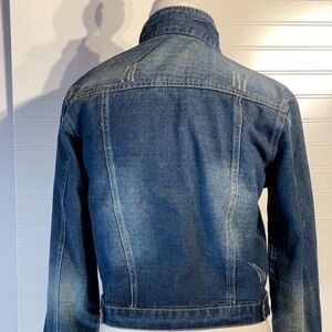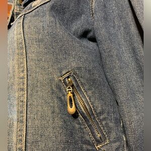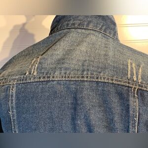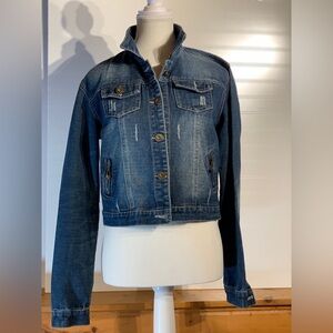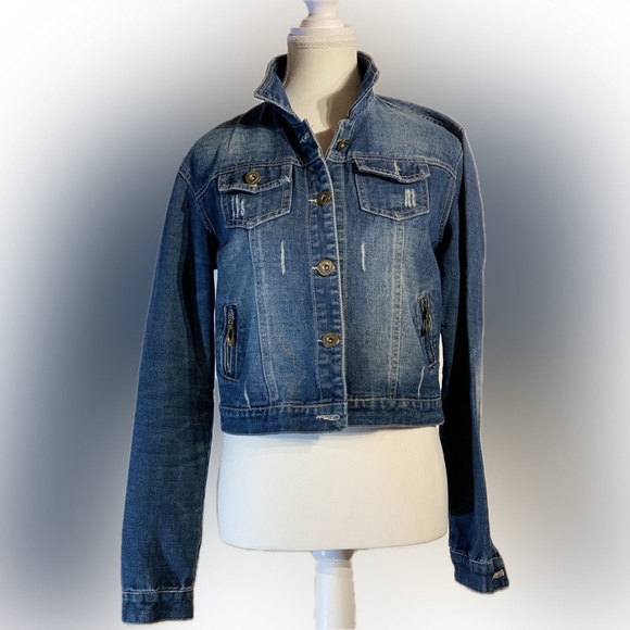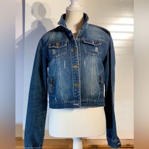 Hendi cropped distressed denim jacket women’s size large, button up, side adjust