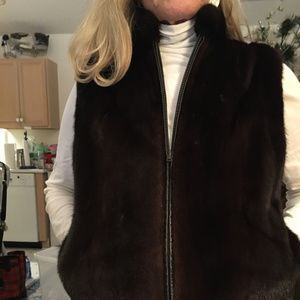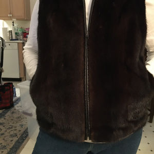 Brown mink fur on front with brown leather on the back of vest. Gently worn. Mint condition.