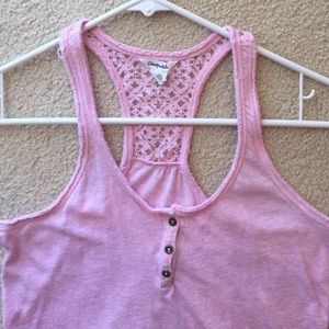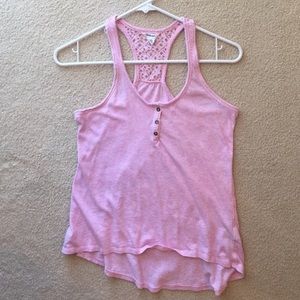 Racerback tank top with lace in the back and buttons in the top. The bottom is high to low. So cute and perfect for summer!