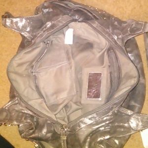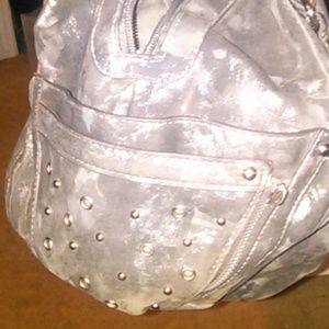Large. Like new. Only used once. Lots of pockets. Mix between Gray and silver/metallic. With studs on side pockets.