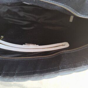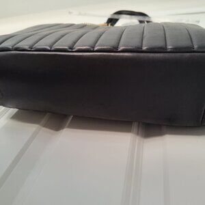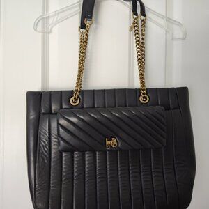 Carried only a couple of times, this buttery soft leather tote/purchase is pure class and sophistication. Satin lining with no tears or stains. Roomy front pocket with closure.l 2 interior pouch pockets and one large zip pocket. Top closure is full zipper. Burnished gold chain should straps with leather shoulder straps. This will hold everything you need for a busy day out, including a laptop or iPad. The bag offers plenty of room with measurements of 16” in width, 11.5” in height, and 4” in depth. Sleek quilted matte black leather exterior. Original tags included along with dust bag. Prepare to get lots of compliments!