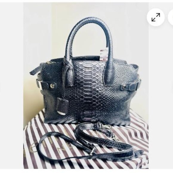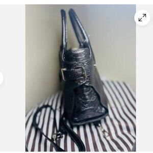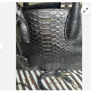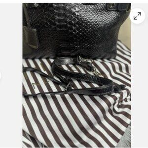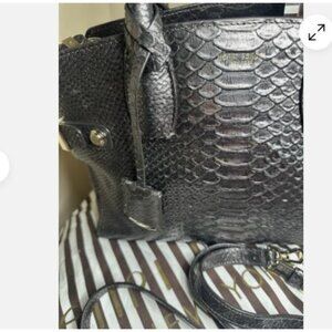 Chic black tote with snakeskin texture. Includes sturdy handles and detachable strap. Ideal for versatile use.