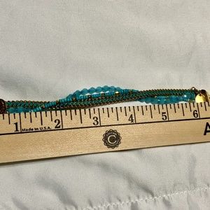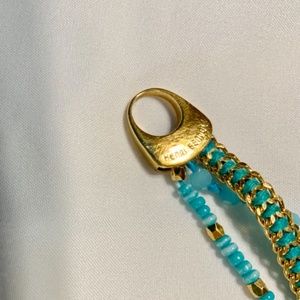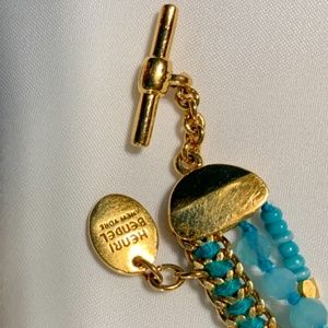 Signed Henri Bendel turquoise light blue beaded toggle bracelet. It’s in excellent condition. There are some minor marks on the golden ends of the bracelet which you can see in the pictures. Perfect for the lady who likes a little VINTAGE STYLE.