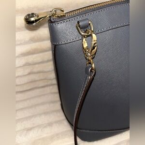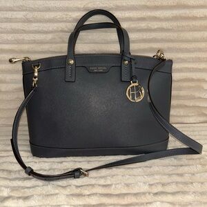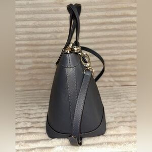 Chic Charcoal satchel with gold accents. Features a detachable strap and top handles. Perfect for versatile styling.