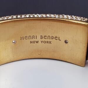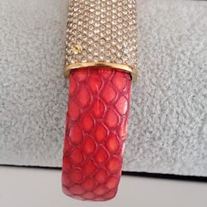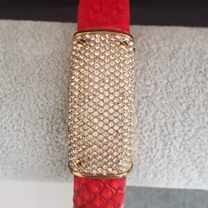 Henri Bendel double hinged Cuff Bracelet has red snakeskin leather over gold plate and a center bar of Swarovski crystals. Some of the color is worn on the snake skin along the edge and can be seen in pics, otherwise very good condition.