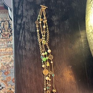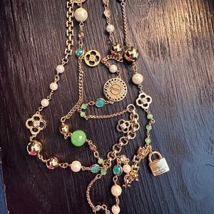 Henri Bendel Double Layer Necklace- Gold, Pearls, and Green Stones with Charms