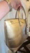 Stylish gold leather tote bag with dual handles. Features a decorative tag with embellishments.
