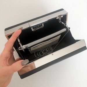 Henri Bendel party box minaudière with metal closure. Black smooth leather with silver hardware + frame. Black satin lining. Detachable snake chain shoulder strap. Zippered pocket and card slots inside. The brand has officially closed and will not be producing products in the future, hence the price and value of this piece. 7”x4.5”x2.5”
