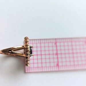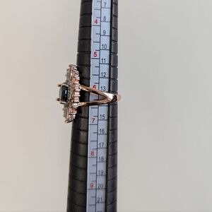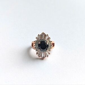 This piece boasts a vintage elegant look that is meticulously designed. The detailed mix of the black main stone framed by a glittering cluster of tapered baguette and round high quality CZ's is dazzling! Plated in rose gold