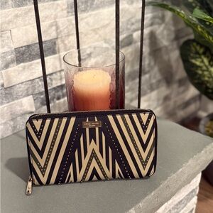Stylish Henri Bendel wallet with a striking black and cream geometric pattern. Features a zip closure and studded accents. Henri Bendel West 57th Zip Around Continental Wallet.