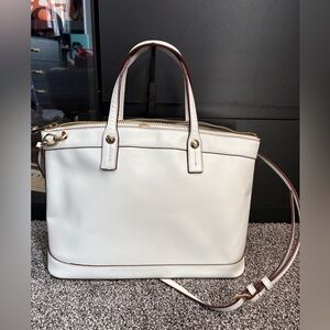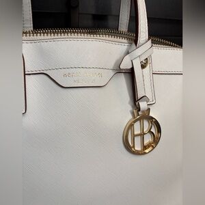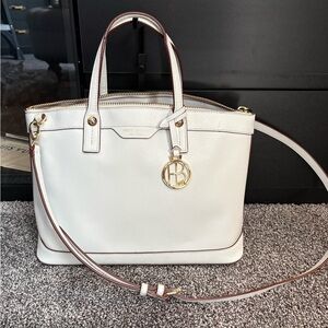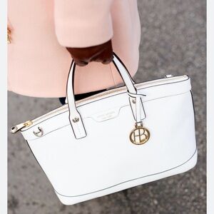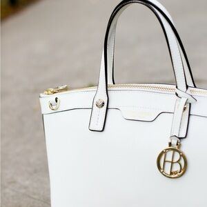 Elegant white tote with gold accents. Features signature Henri Bendel charm. Perfect for any occasion.