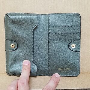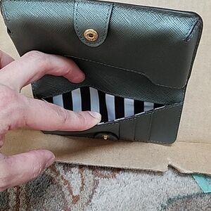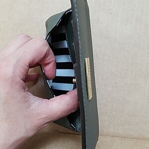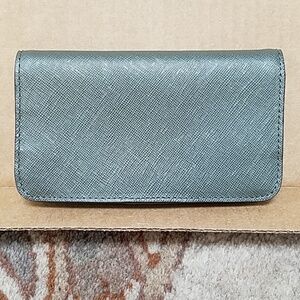 Steel grey with a blue shimmery tint. 5 1/2" long, 3" tall. Excellent used condition, Only sign that it was ever used is on the gold henri bendel logo