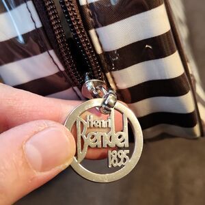 preowned- see pics, super spacious, stands upright to keep on the counter on the go! signature henri bendel striped bag