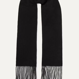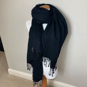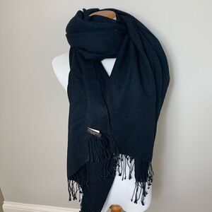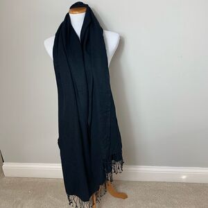 Black Henri Bendel cashmere and silk shawl with fringe trim at edges.