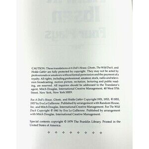 1979 Franklin Library edition of Henrik Ibsen: Four Plays is a stunning collectors volume bound in full genuine leather with intricate gilt designs on the cover and spine. Published as part of Franklin Librarys Great Books of the Western World series, it features high-quality acid-free paper, gilded page edges, and a satin ribbon bookmark. The book includes four of Ibsens classic playsA Dolls House, Ghosts, Hedda Gabler, and The Wild Duckand is illustrated throughout with striking artwork by Tony Eubanks.