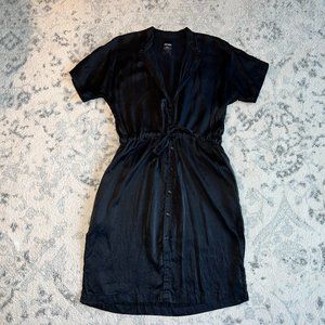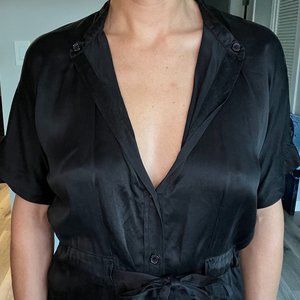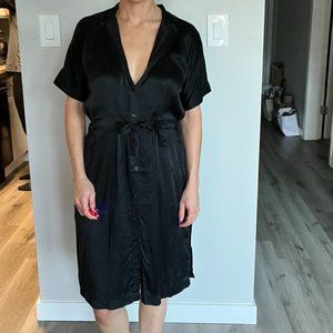 Modern elegance defines this silk-georgette shirtdress topped by a smooth band collar and finished with a flattering waist tie.