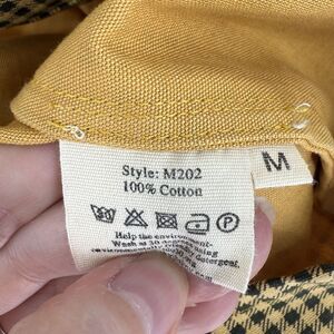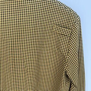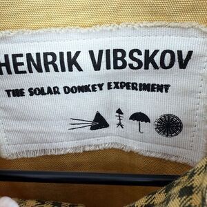 This is a Henrik Vibskov shirt in size Medium with a yellow and black check pattern. It has a collared neckline, long sleeves, and a button-up closure. The material is cotton, making it a casual button-down shirt for men. The unique title "Solar Donkey Experiment" adds an interesting touch to this stylish and trendy piece.