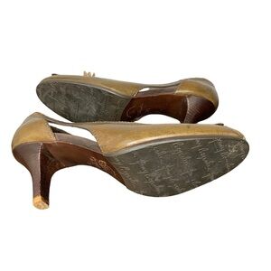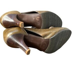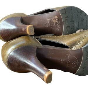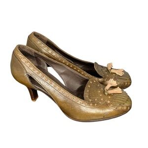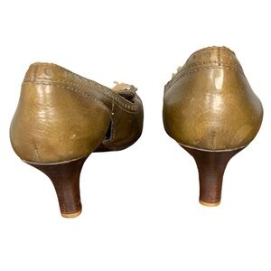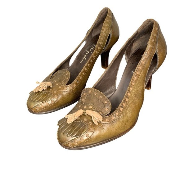 Henry Beguelin Handmade in Italy army green leather 40’s style heeled pump with khaki tan tassels. Dot tooling. Flaw: scuffed on heels and bottom of sole and a black mark on right side of right shoe and a mark from I believe the maker on the heel. Beautiful shoes! Classic through and through! Tags: pin up, 40’s, tassels, oxfords, vintage, Italian. Size 6.5