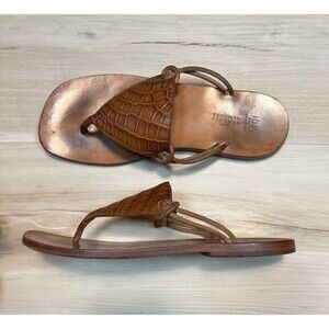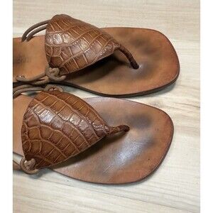 Henry Cuir for Barneys New York brown leather thong sandals with embossed alligator pattern, women’s size 38 EU. Made in Italy. These would be ideal for someone who is normally a US 7. They might work if you are a 7-7.5, but they do run a little small for a 38 EU. Please see measurement pics in slideshow. The toe to heel is 9.75” and the width is 3.5”. Thanks for looking!