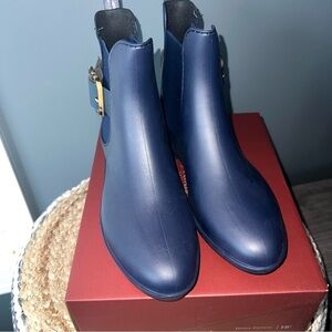 Ankle High Waterproof Rubber Rain Boots with a Leopard Detail Side Buckle. Pull On Styling. Navy Blue. New in Box🚭