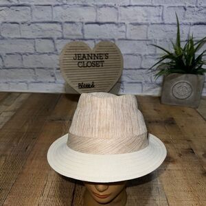 The Groveland, from Henschel Hat Company, infuses a natural look to an already stunning fedora. This summer hat is made of a lightweight linen-cotton blend and features a wood grain pattern, and self band with leather accents.