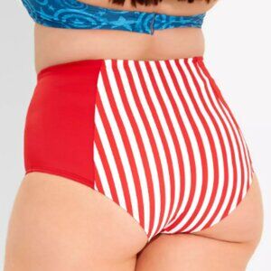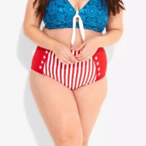 Her Universe Marvel Captain America Swim Bottoms Join the Avengers for summer fun! These Captain America inspired swim bottoms have a red and white, stars and stripes design. High Waisted Shell: 82% nylon; 18% spandex Lining: 100% polyester Hand wash cold; dry flat Listed in junior sizes