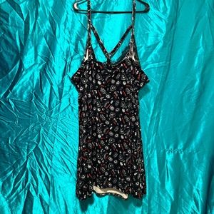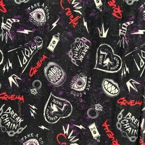 Channel your inner wicked fashionista in this slip dress from Cruella. It is velvety with black lace trim at the chest and harness-inspired strappy detail. It has a toss print of icons such as "Break the chain," eye with "Take a good look," diamond ring, crown, "Cruella" in red and splashes of purple. There are side seam hip pockets and adjustable straps.