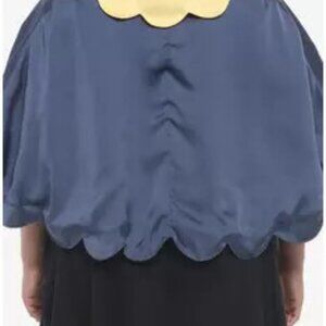 Whether you're heading to the castle or wandering through the forest, make sure you stay layered up in this adorable capelet! Celebrate the 85th anniversary of Snow White And The Seven Dwarfs with this satin capelet, featuring a scallop hem throughout with an embroidered apple and Snow White's silhouette at the chest. Comes with a contrast red bow tie at the center and a scoop neckline with a yellow scalloped collar.