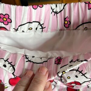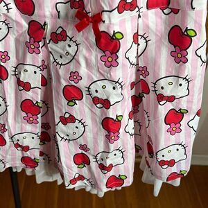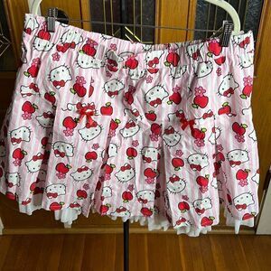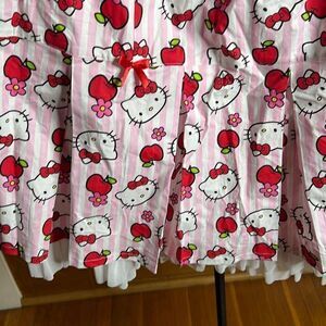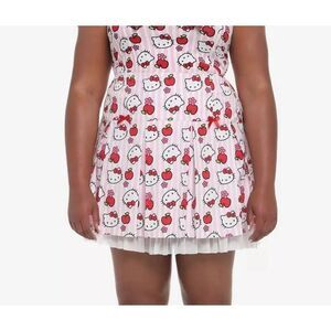 Hello Kitty Apple Stripe Pleated Skirt Plus Size Finishing off your Sanrio style with some pretty bows on top! Channel some Hello Kitty vibes right meow with this pleated skirt, featuring an allover toss of Hello Kitty, apples and flowers on a pink striped background. Comes with pleats and 2 dainty red bows on the wide yoke, back zipper closure and a white mesh layer underneath for dimension.
