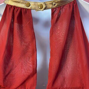 This out-of-stock costume gown from The Marvels is inspired by Captain Marvel's newest floor length gown from the film. It comes with dramatic cold shoulders and her signature faux leather star symbol embroidered from chest to navel. Side zipper, snap halter neckline. Additional drapes on the skirt you can connect to your fingers. Fully lined. Designed by Michael Burson. Size 28. The dress is in very good condition except for small section of hem with DAMAGE/WEAR along bottom 1-2 inches of hemline which includes white markings and small holes from hem dragging. See Pics. (Dress is extremely long and could be cut and hemmed if desired.) costume is still fabulous and you will be a stand out at any Halloween Party.