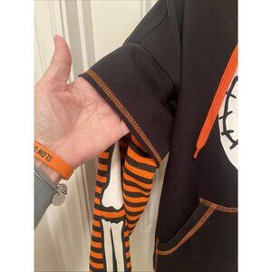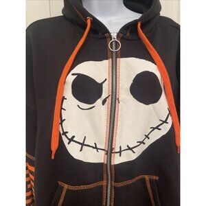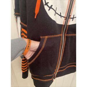 NWOT The Her Universe Nightmare Before Christmas Jack Stripe Split Oversized Hoodie is a black full zip hoodie made of a combination of polyester and cotton. It features a colorblock pattern with white stripes and a skull and crossbones logo accent. The hoodie has long sleeves and a relaxed fit, making it suitable for activewear occasions. It also has a zipper closure and is machine washable. The hoodie is part of the Disney product line and is available in size M for women. Its themes include Christmas, rock, horror, punk, skull, cartoon, steampunk, and Halloween.
