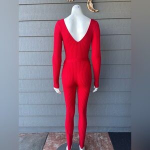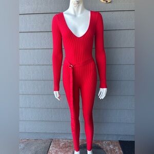 Chic red ribbed jumpsuit with deep neckline. Perfect blend of style and comfort.